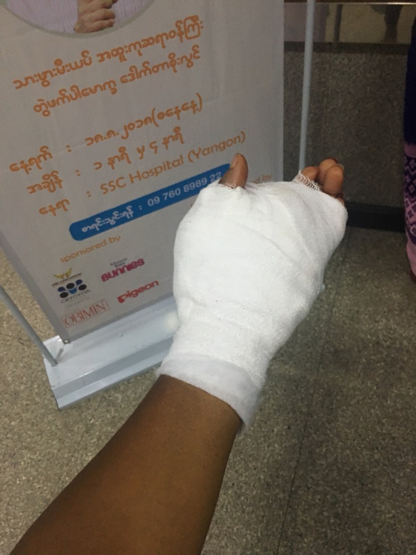We get to hospital #1 with hands clasped together in my grocery bag filled with blood. The other great thing is that of course communication is a challenge because we three don’t speak Burmese and English proficiency is limited. They tell us no photos and proceed to take photos of my wound.